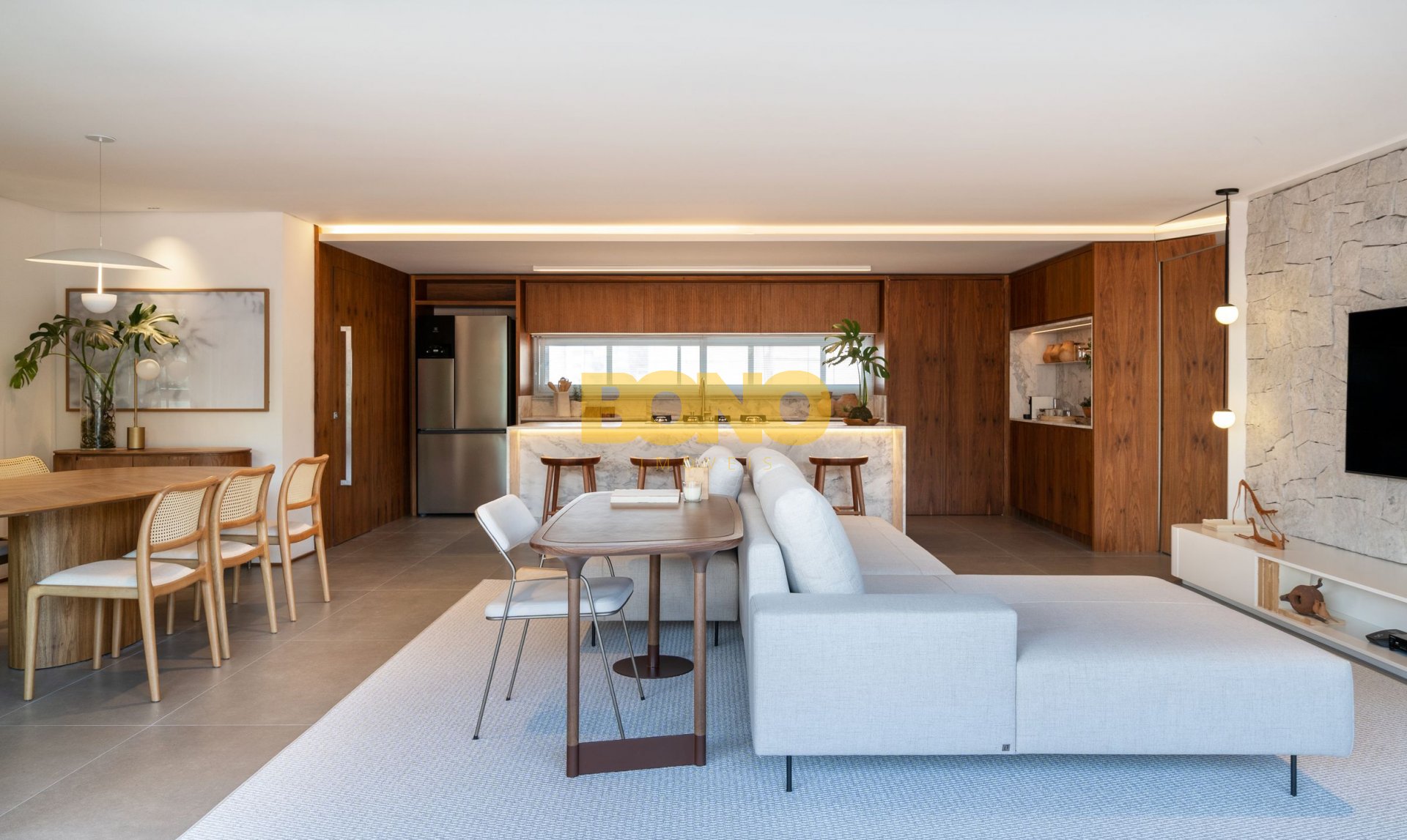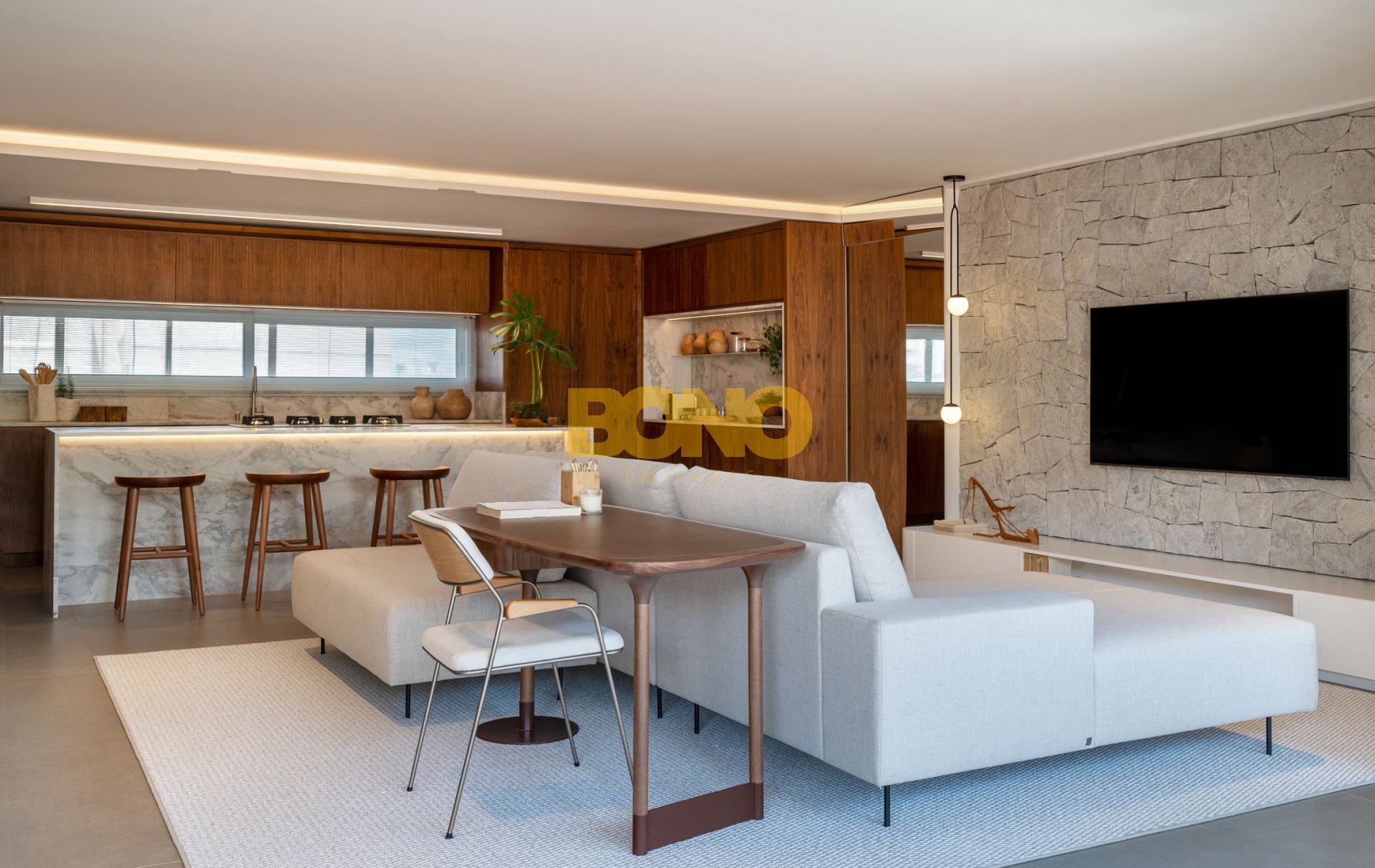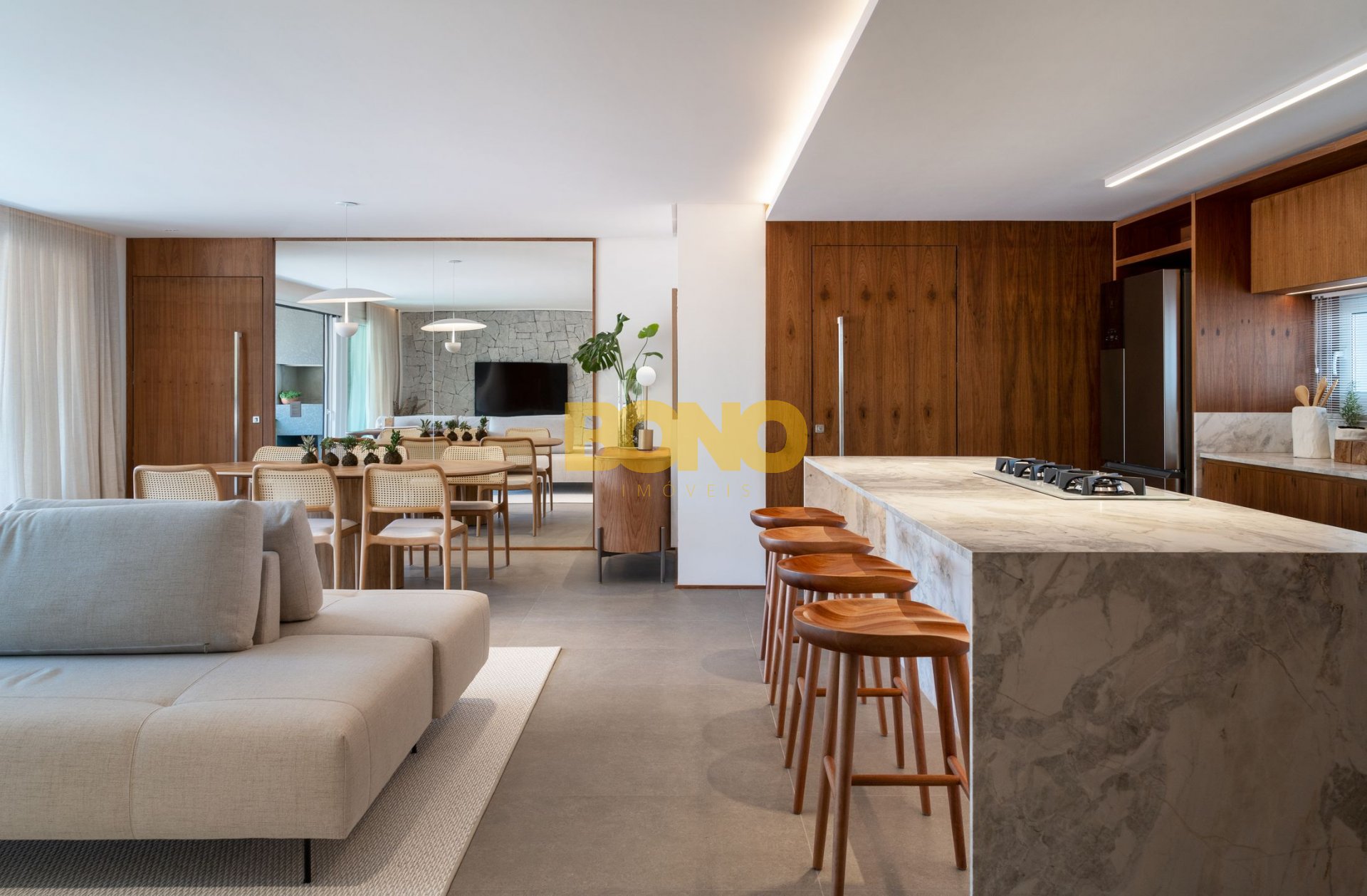 . Ampla sacada gourmet, com peitoril de vidro e integração com o estar e jantar