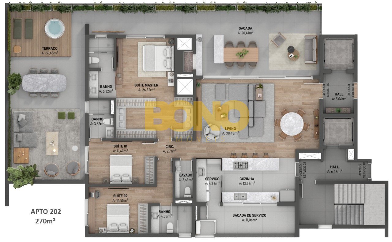 Com orientação solar NORTE, os apartamentos possuem de 156m2 a 191m2 privativos, com amplas sacadas e grandes esquadrias que possibilitam uma excelente integração entre o living e a sacada. Além disso os apartamentos contam com