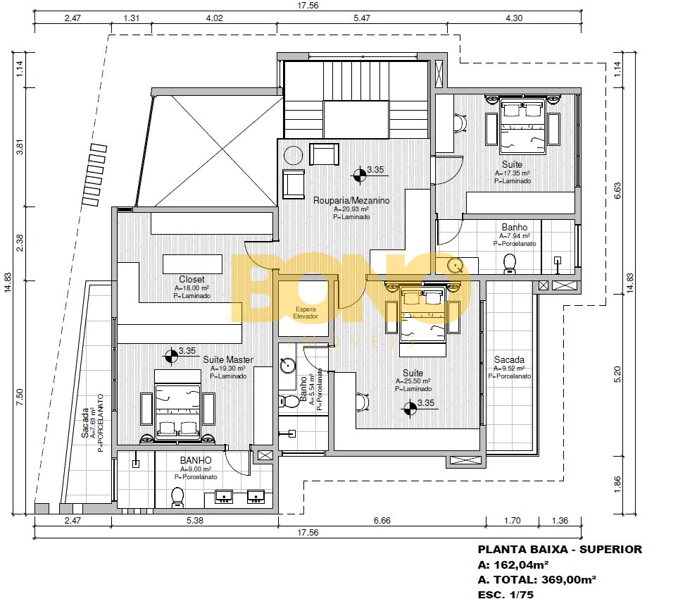 No pavimento superior, temos duas suítes e mais uma suíte Master com 46,00m2, incluindo closet e banheiro.
